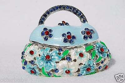 Title (ebay affiliate link): SWAROVSKI CRYSTAL BEJEWELED ENAMELED HINGED TRINKET BOX- BABY BLUE & WHITE PURSE