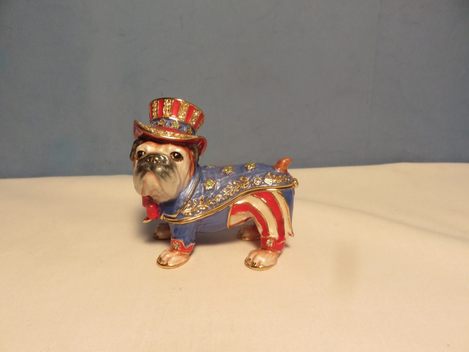 Title (ebay affiliate link): Bulldog Metal Enamel Rhinestone Trinket Box Red White Blue Hat Stars Stripes