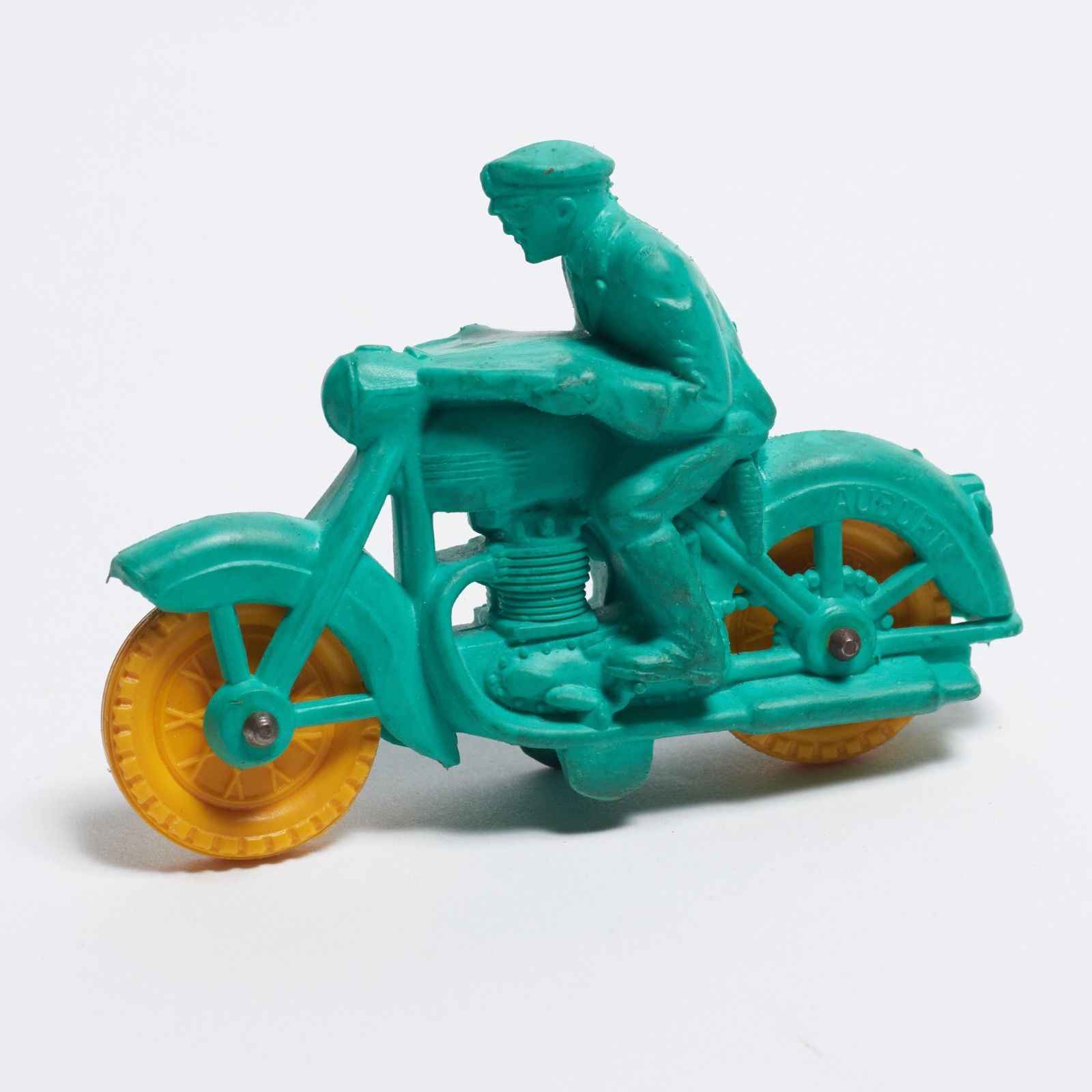 Title (ebay affiliate link): Vintage Auburn Hard Rubber Motorcycle Toy Yellow Wheels Very Good Condition!!!