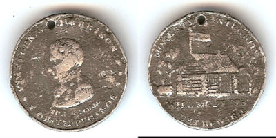 Title (ebay affiliate link): LARGE 1840 WHITE METAL WM. H. HARRISON LOG CABIN MEDAL