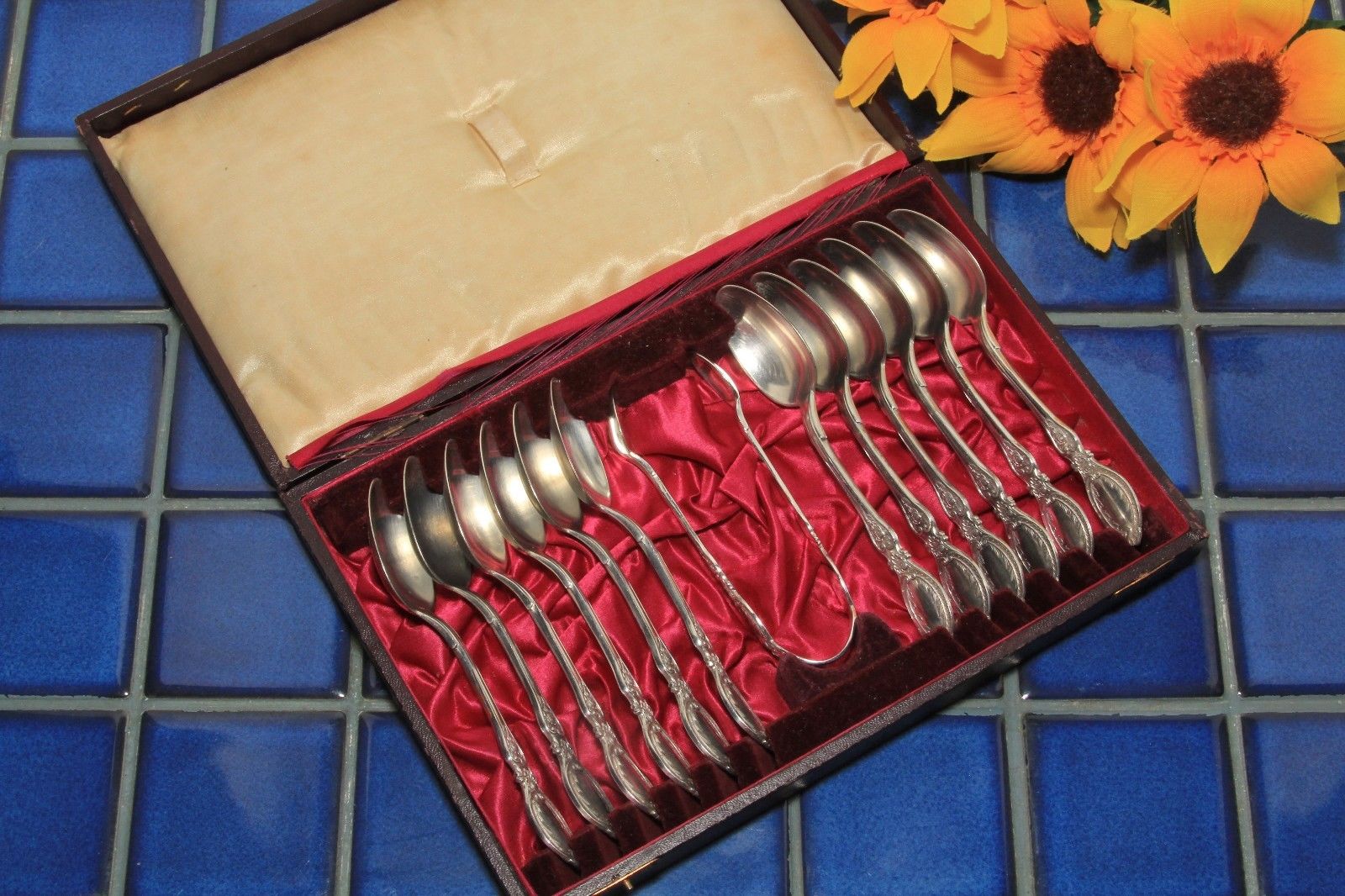 Antique Floral 13 pc 5 o''clock Teaspoon Set in Box Silverplate FREE SHIP