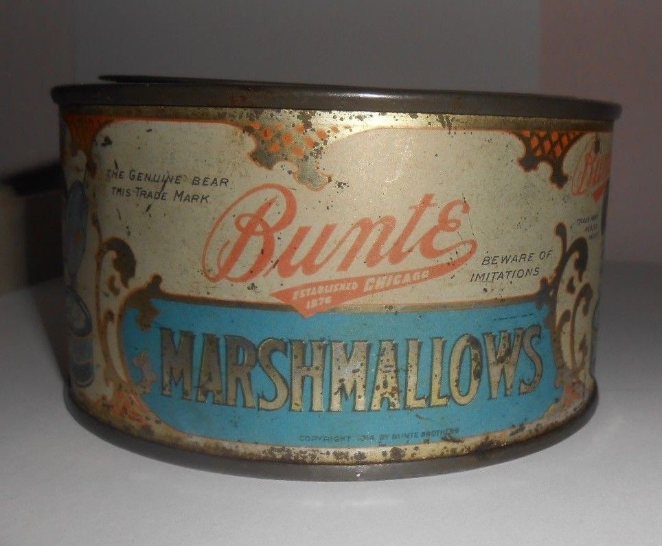 Title (ebay affiliate link): Vintage Bunte Brothers 4 Oz Marshmallows Advertising Tin With The Lid=1914