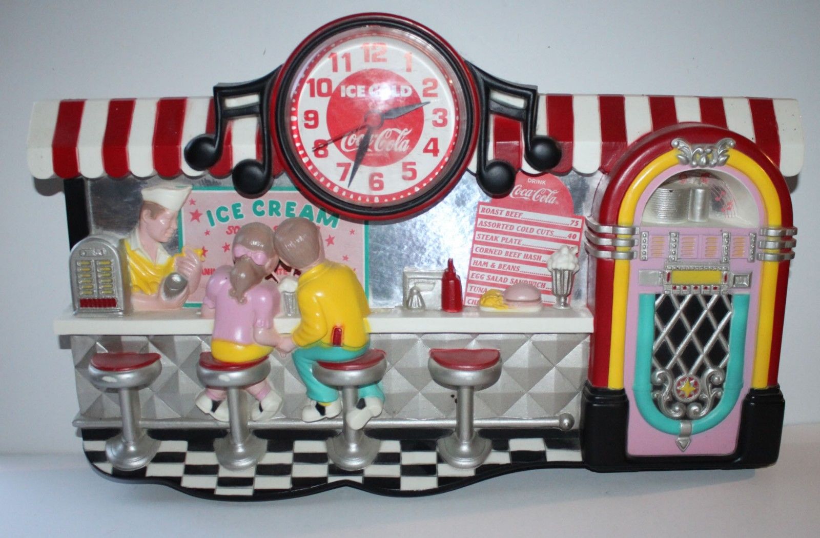 Title (ebay affiliate link): Vintage Coke Coca Cola Clock Retro Diner Ice Cream Soda Fountain Jukebox Music