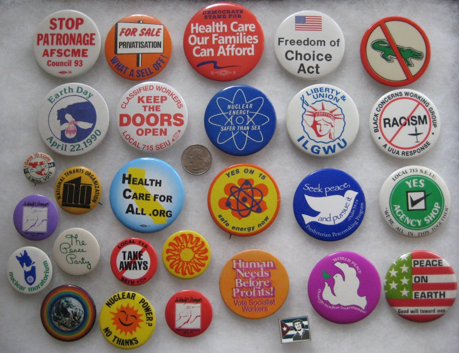 Title (ebay affiliate link): Large Lot Left Wing Cause Pinback Buttons Labor Unions Peace Anti Nuke Nuclear