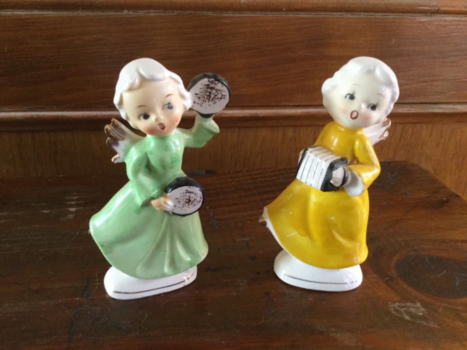Title (ebay affiliate link): 2 vintage Angels with instruments Japan, accordion, tambourines, bright gowns.