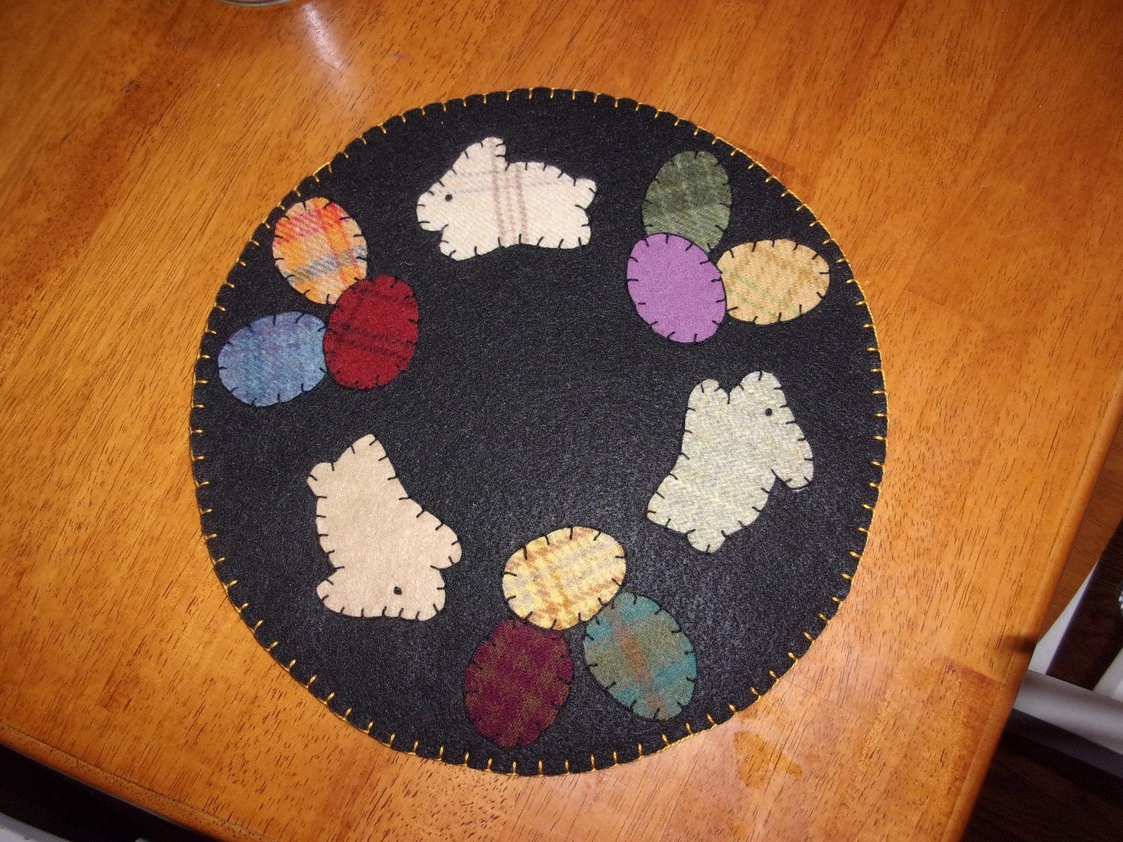 Title (ebay affiliate link): Handmade Penny Rug Candle Mat 11 inch Bunnies and Colored Eggs Spring Easter