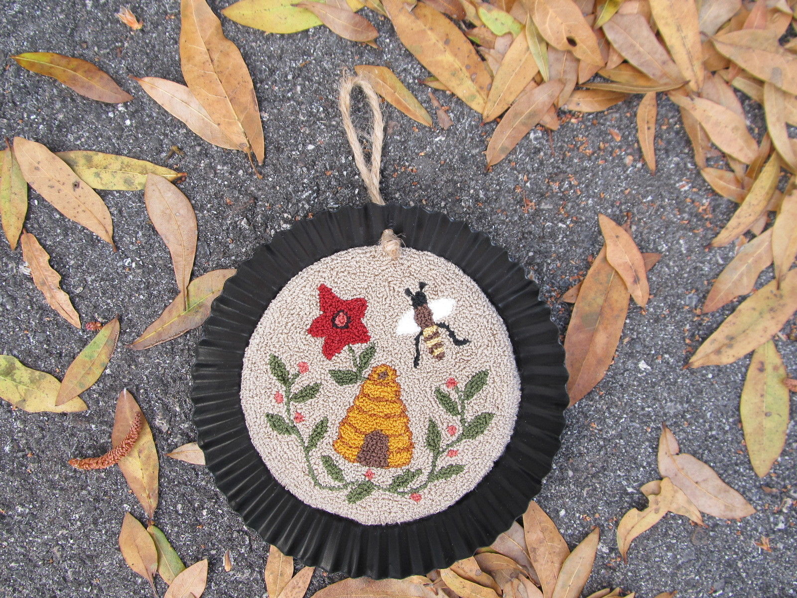 Title (ebay affiliate link): Primitive Punch Needle Bee Hive Tart Tin Folk Art Country Handmade New