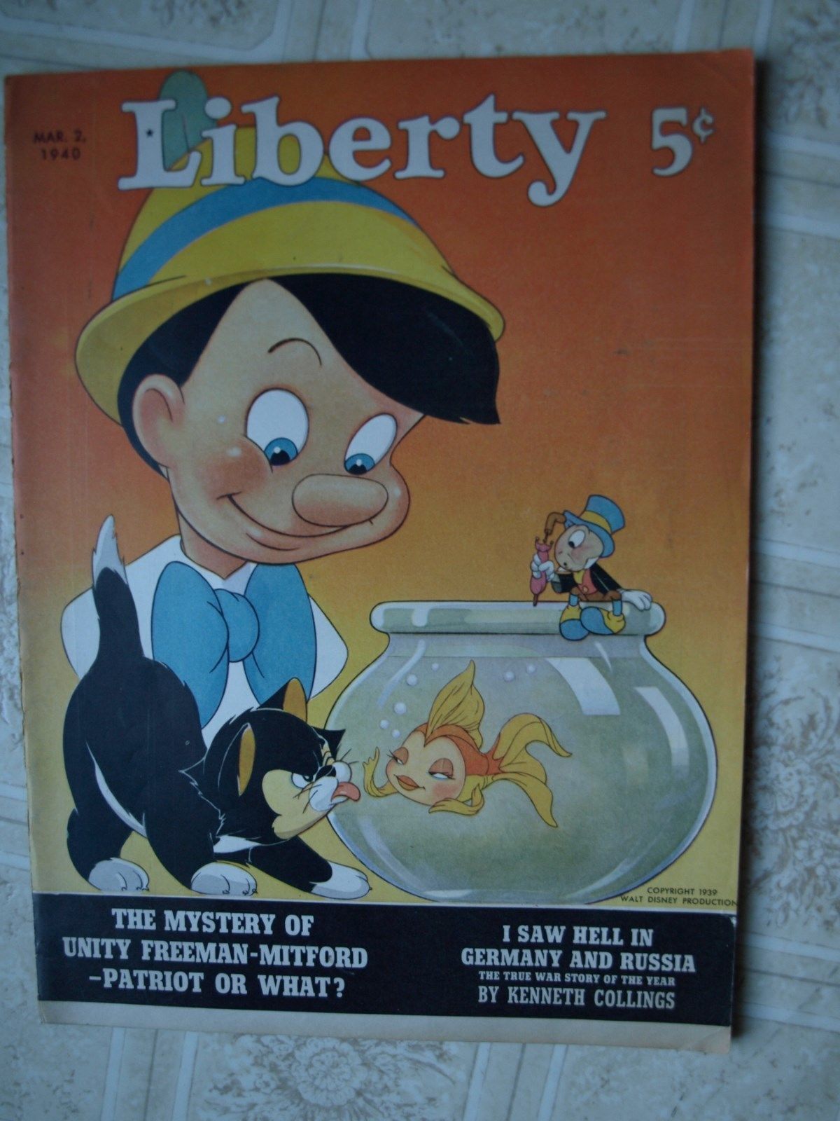 1940 Disney Pinnochio on cover of Liberty, coca cola ad, Joe De Maggio