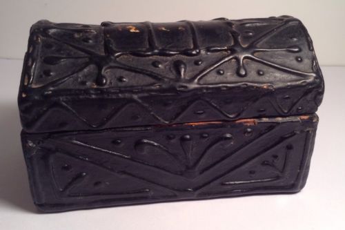 Title (ebay affiliate link): VINTAGE ANTIQUE MINIATURE WOODEN HUMPBACK TRUNK BLACK WITH RAISED DECORATION