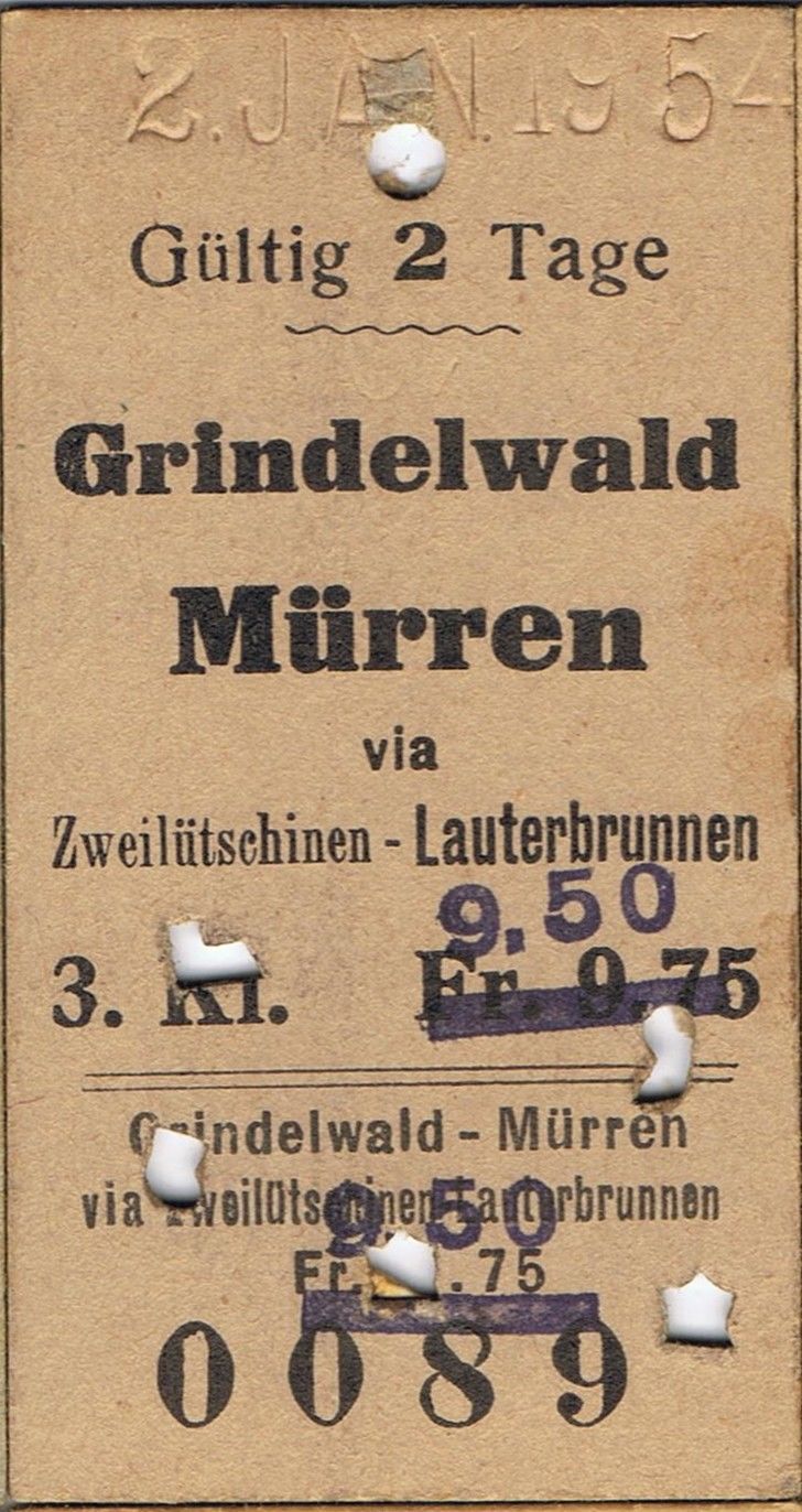 Railway tickets Switzerland Grindelwald to Murren third class single 1954
