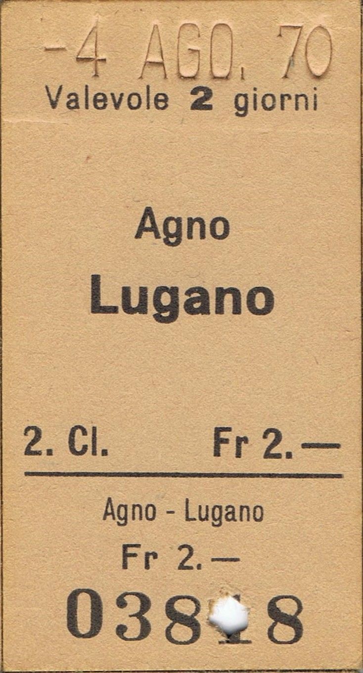 Railway tickets Switzerland Agno to Lugano second class single 1970