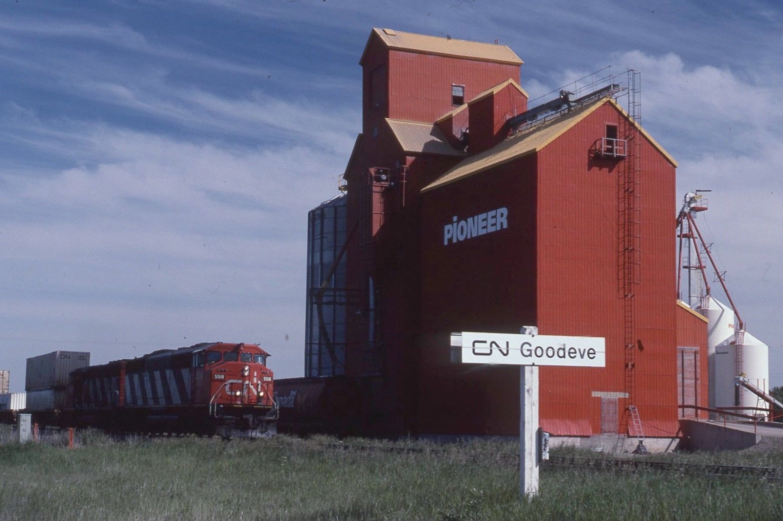 ORIGINAL KODACHROME CANADIAN NATIONAL RWY GRAIN ELEVATOR SCENE GOODEVE,SASK 2002