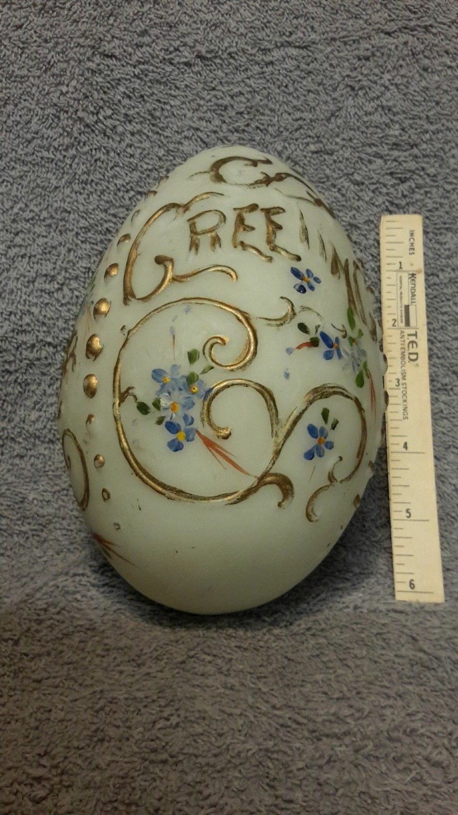 Title (ebay affiliate link): Victorian EASTER EGG Raised Gold Letters XLARGE, EASTER GREETING, Milk Glass