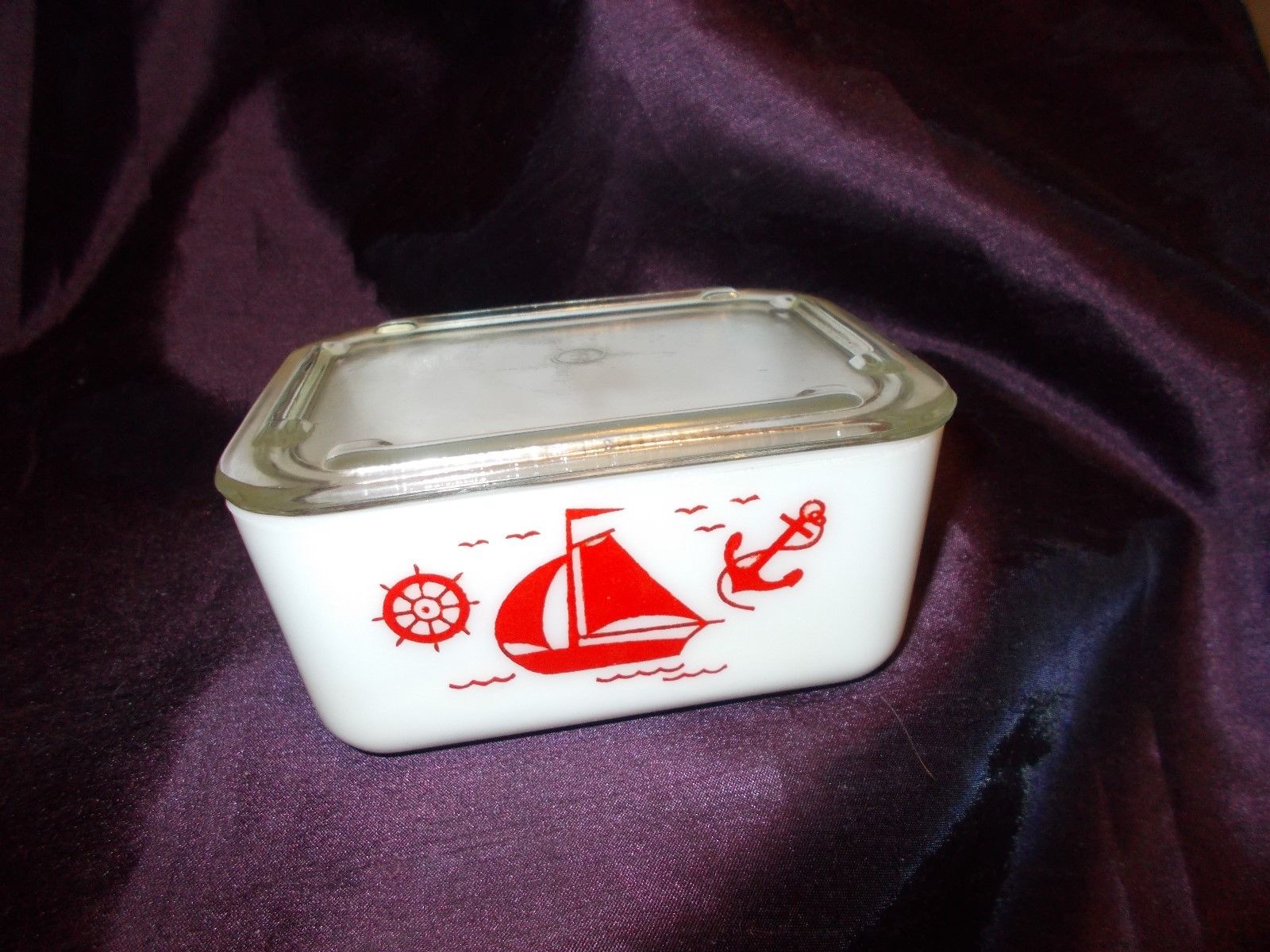 Title (ebay affiliate link): Vintage McKee Milk Glass Refrigerator Dish with Lid Sailboat Anchor Wheel in Red