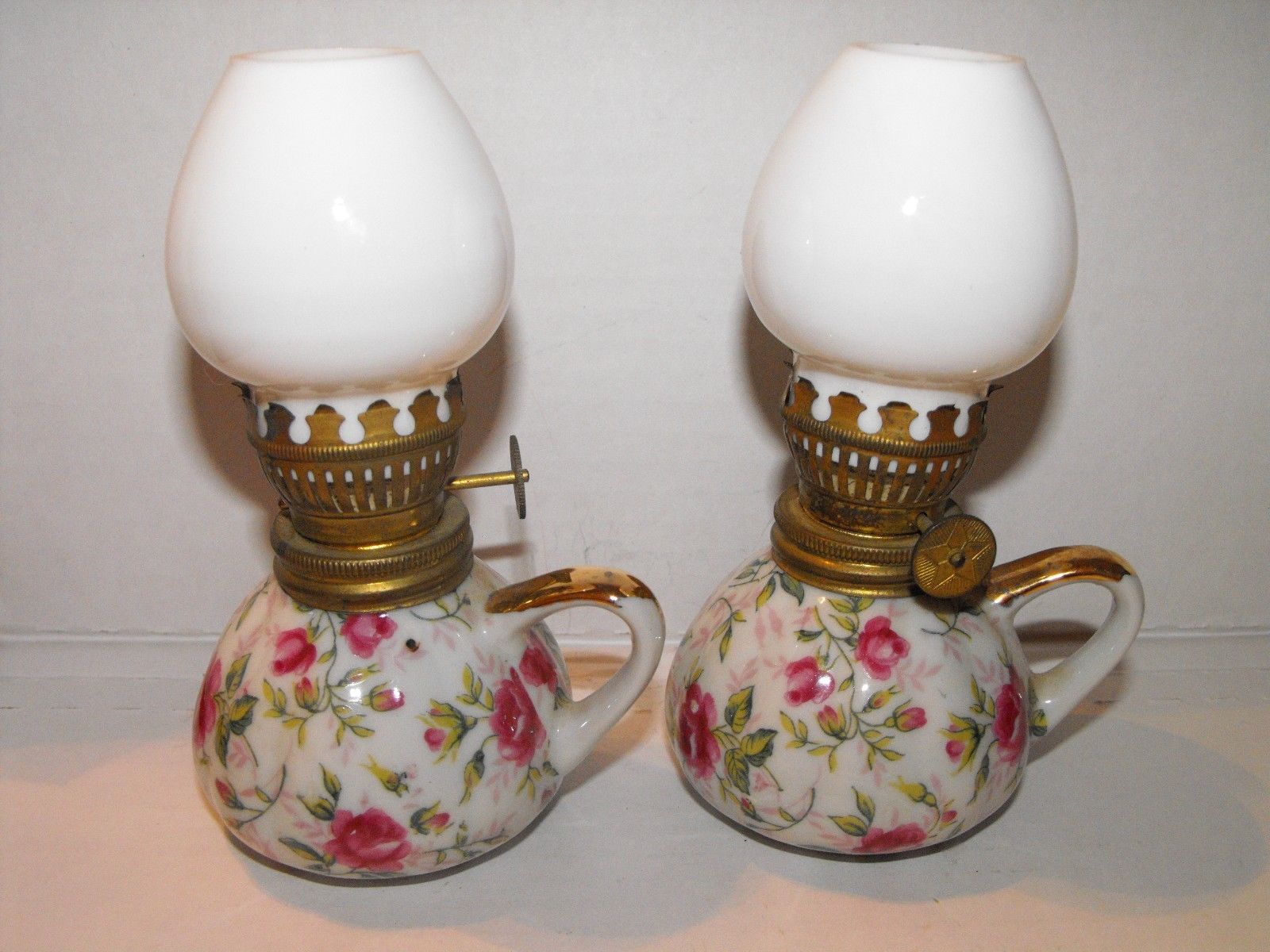 Title (ebay affiliate link): Vintage Lefton Pair of Glass Oil Lamps Floral Print with Milk Glass Shades