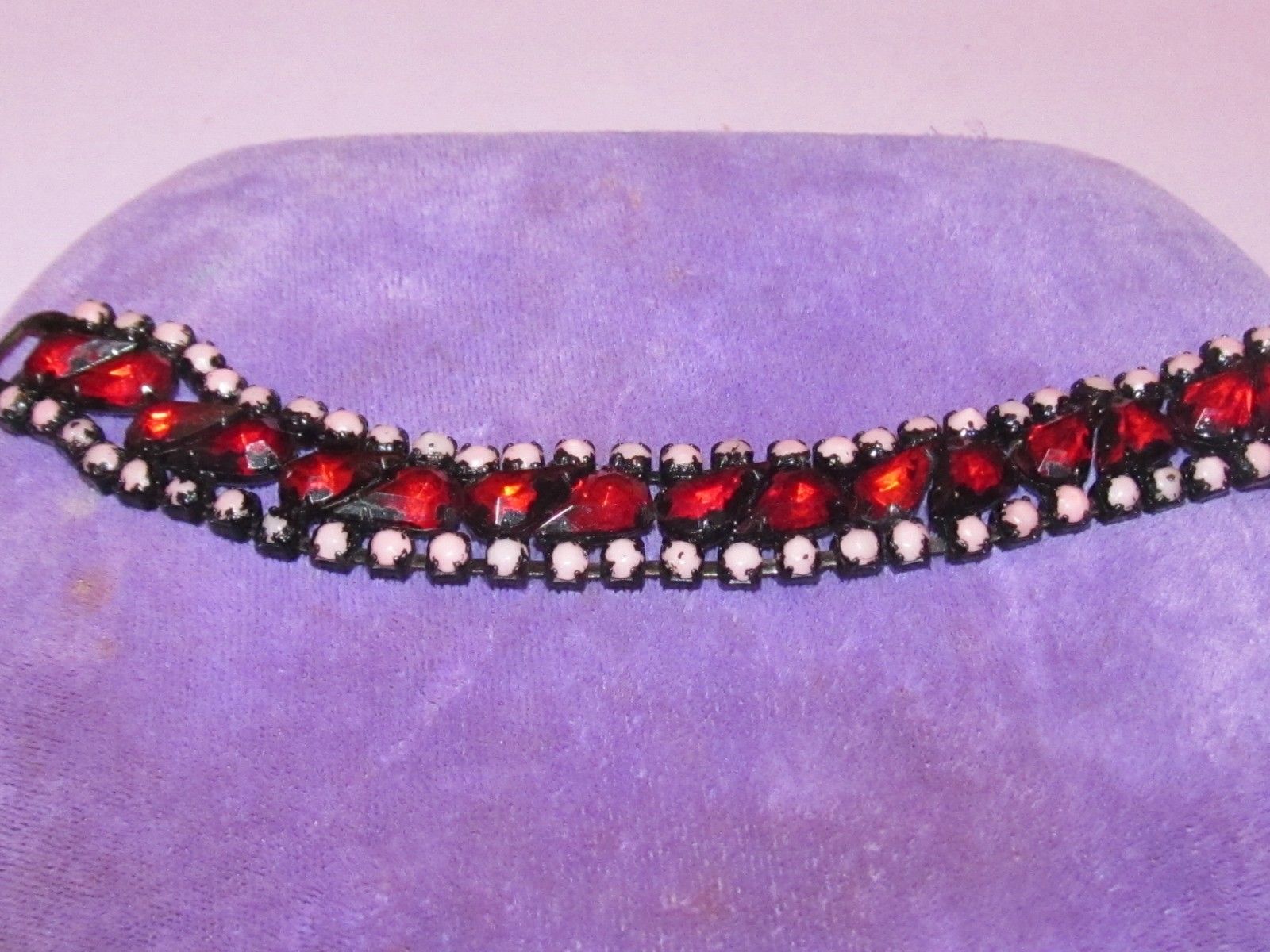 Title (ebay affiliate link): Vintage Weiss Japanned Bracelet with Red Rhinestones Pink Milkglass