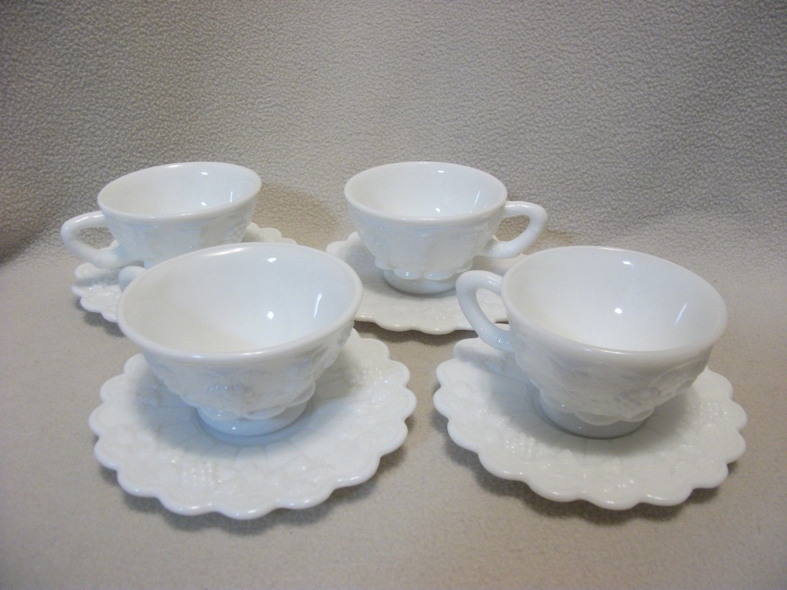 Title (ebay affiliate link): Vintage Westmoreland Paneled Grape White Milk Glass, 4 Sets of Cups & Saucers