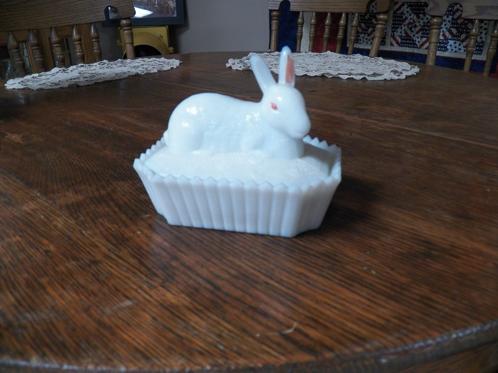 Title (ebay affiliate link): Vintage White Milk Glass Covered Easter Bunny Dish on Picket Fence
