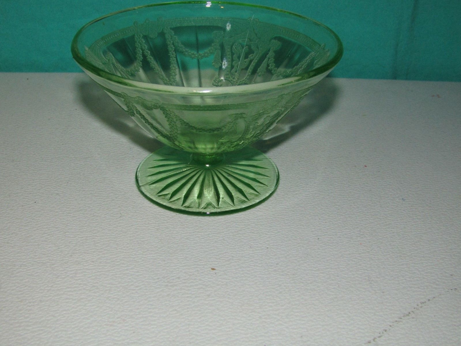 Title (ebay affiliate link): VINTAGE GREEN DEPRESSION GLASS FOOTED CANDY DISH - Raised Victorian Pattern