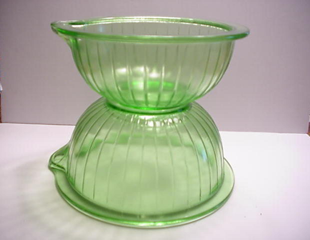 Title (ebay affiliate link): Vintage Pair Tufglas Green Depression Ribbed Mixing Batter Bowls