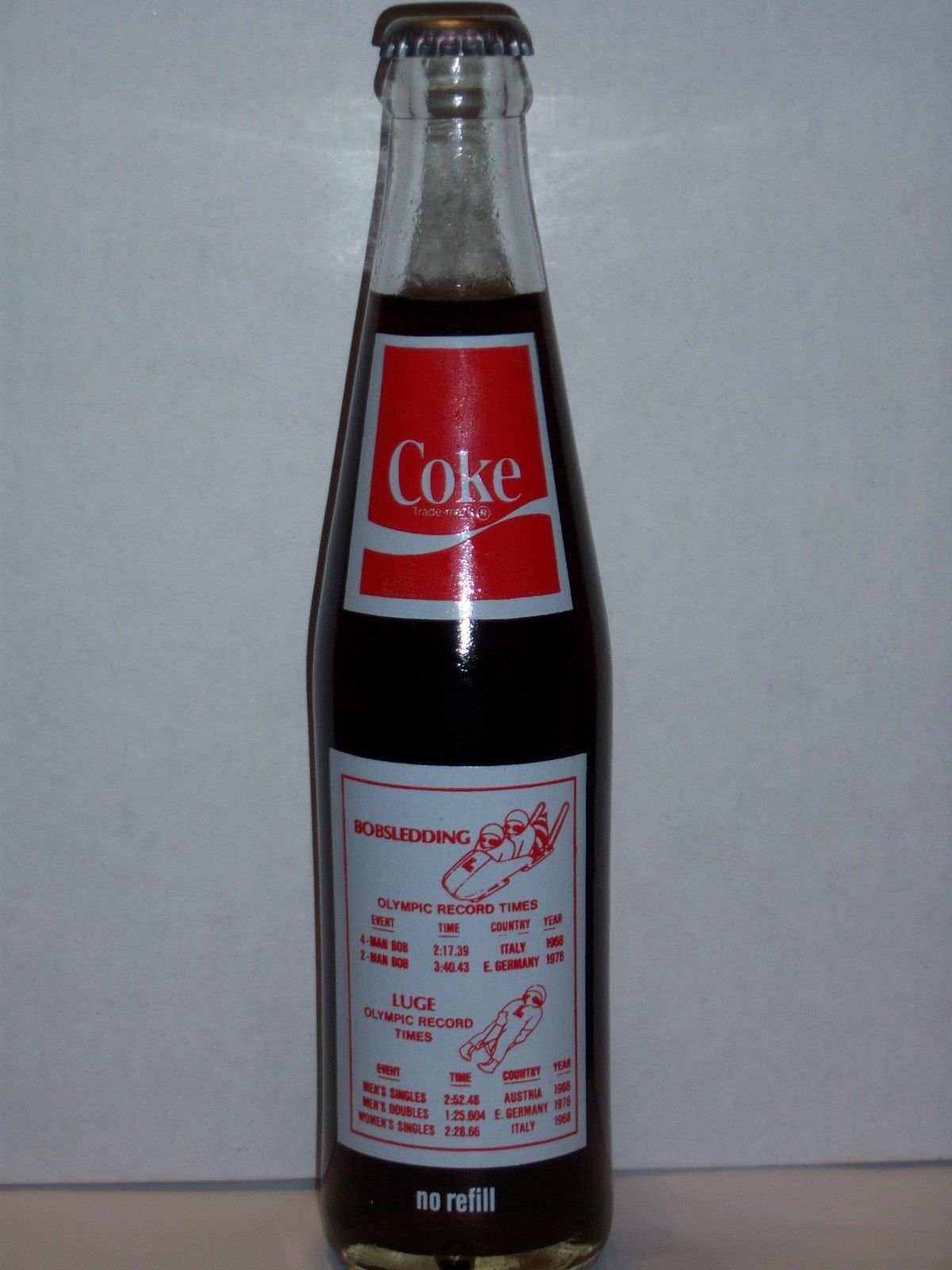 Title (ebay affiliate link): 10 OZ COCA COLA COMMEMORATIVE BOTTLE - 1980 WINTER OLYMPICS BOBSLED LUGE