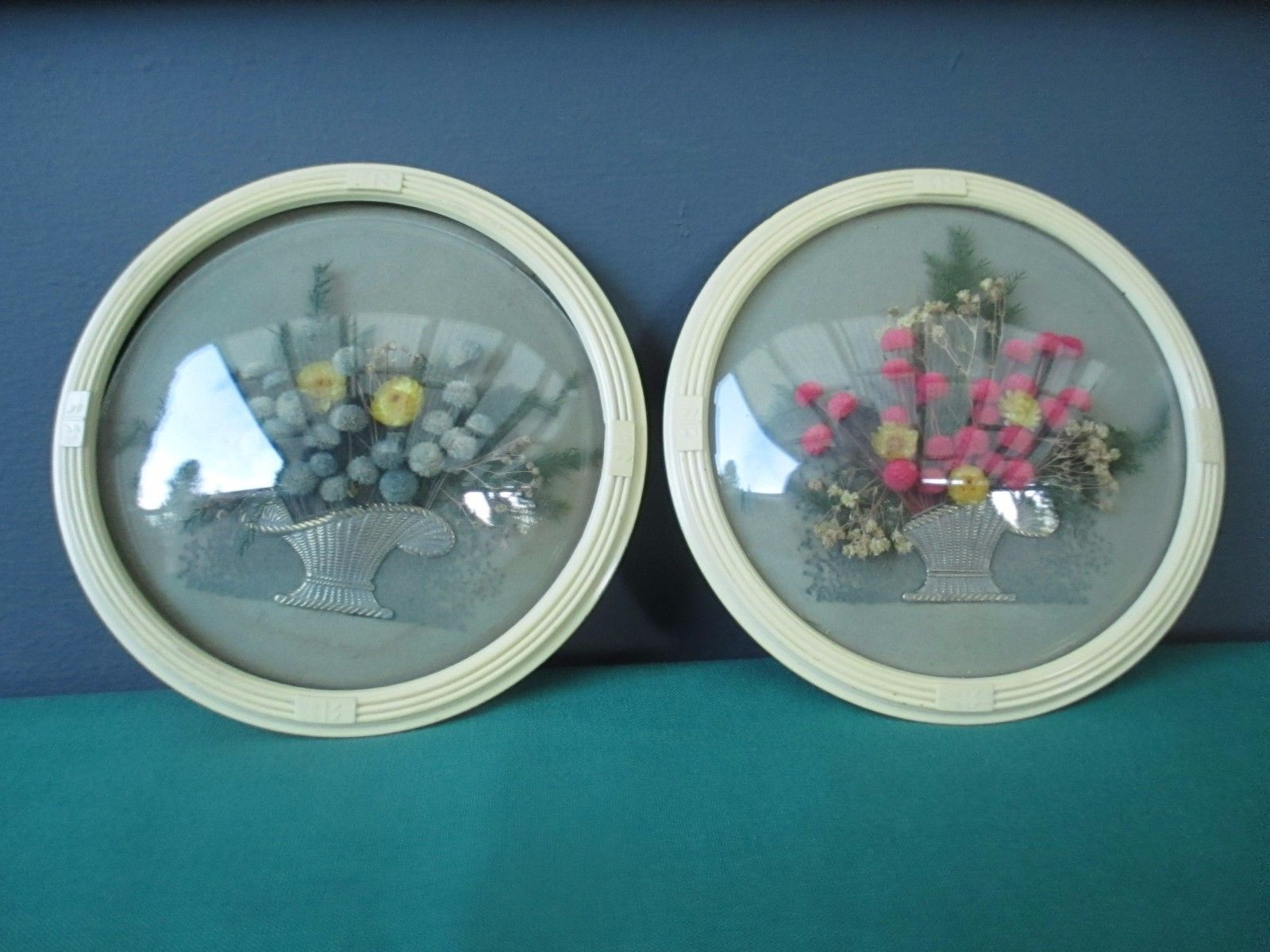 Title (ebay affiliate link): VINTAGE DRIED FLORAL GLASS DOMED PICTURES - LOT OF 2 - 5" DIA - OLD RIBBED PLAST