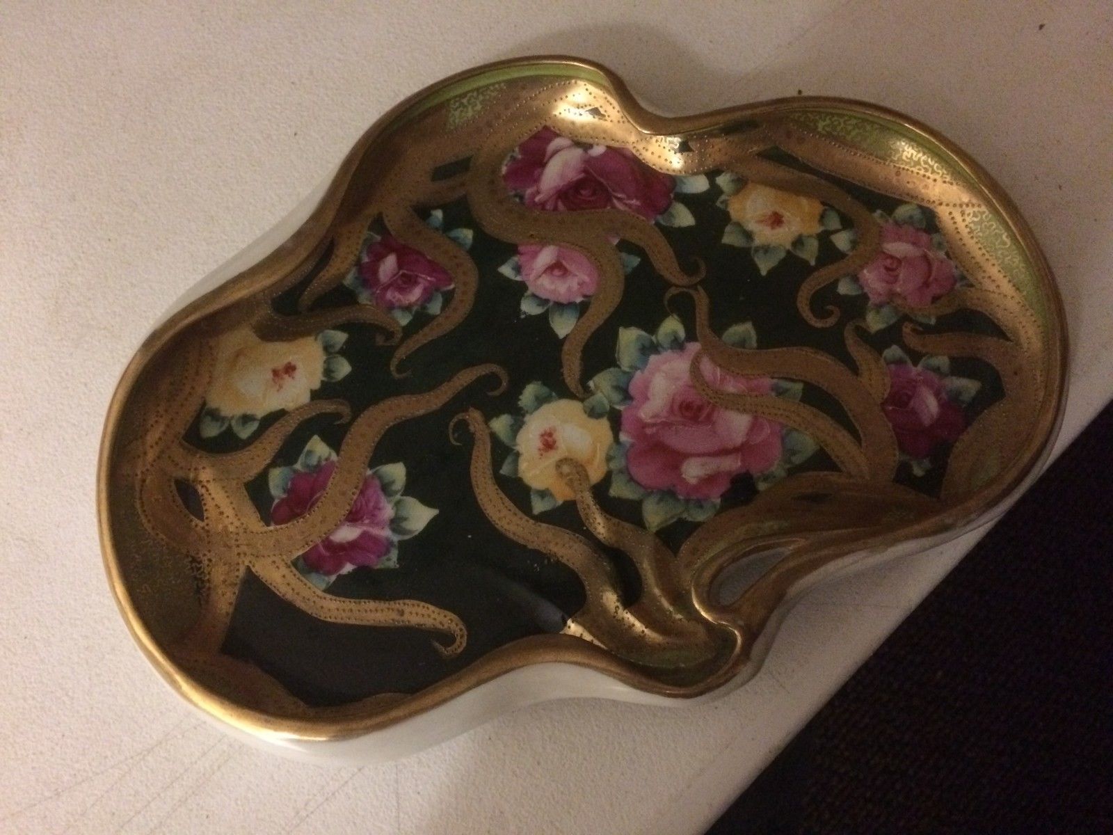 limoges Nippon Hand Painted Vanity Tray Large Yellow Red Roses Gold Art Nouveau