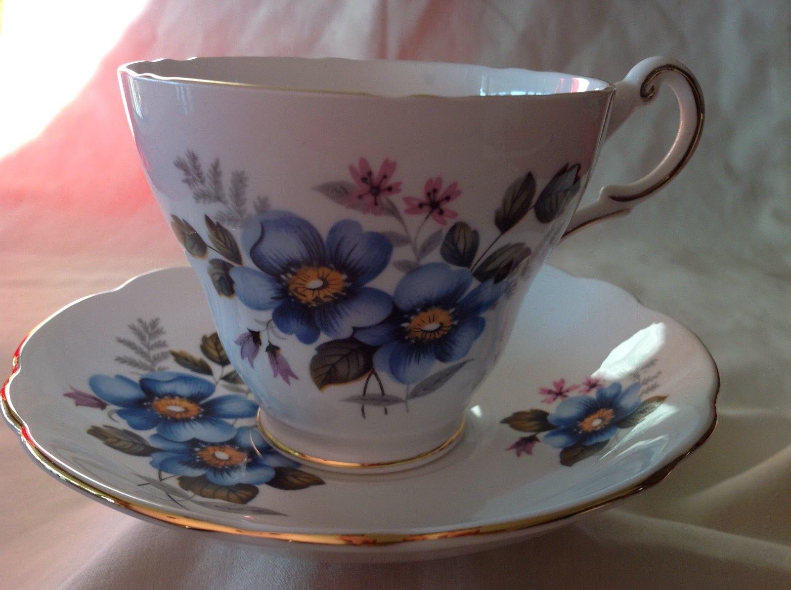 Title (ebay affiliate link): Vintage Regency English Bone China Tea Cup and Saucer - Blue Pink Floral Flowers
