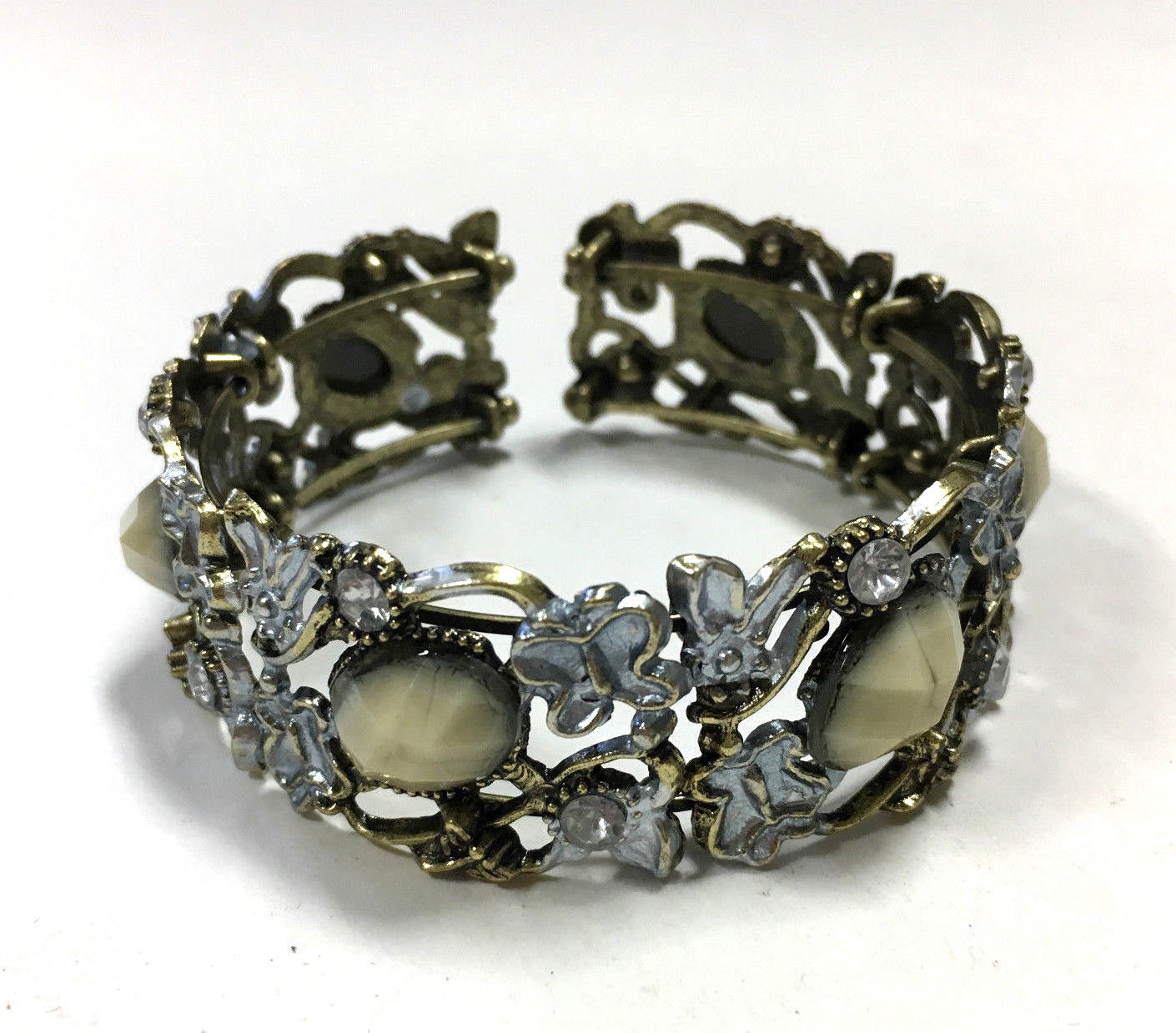 Title (ebay affiliate link): Rhinestone & Cream Jeweled & Enamel Wide Cuff Bangle Bracelet Antique Gold i187d