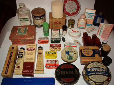 VINTAGE TINS BOTTLES TUBE ASPIRIN TYPEWRITER RIBBON LOT