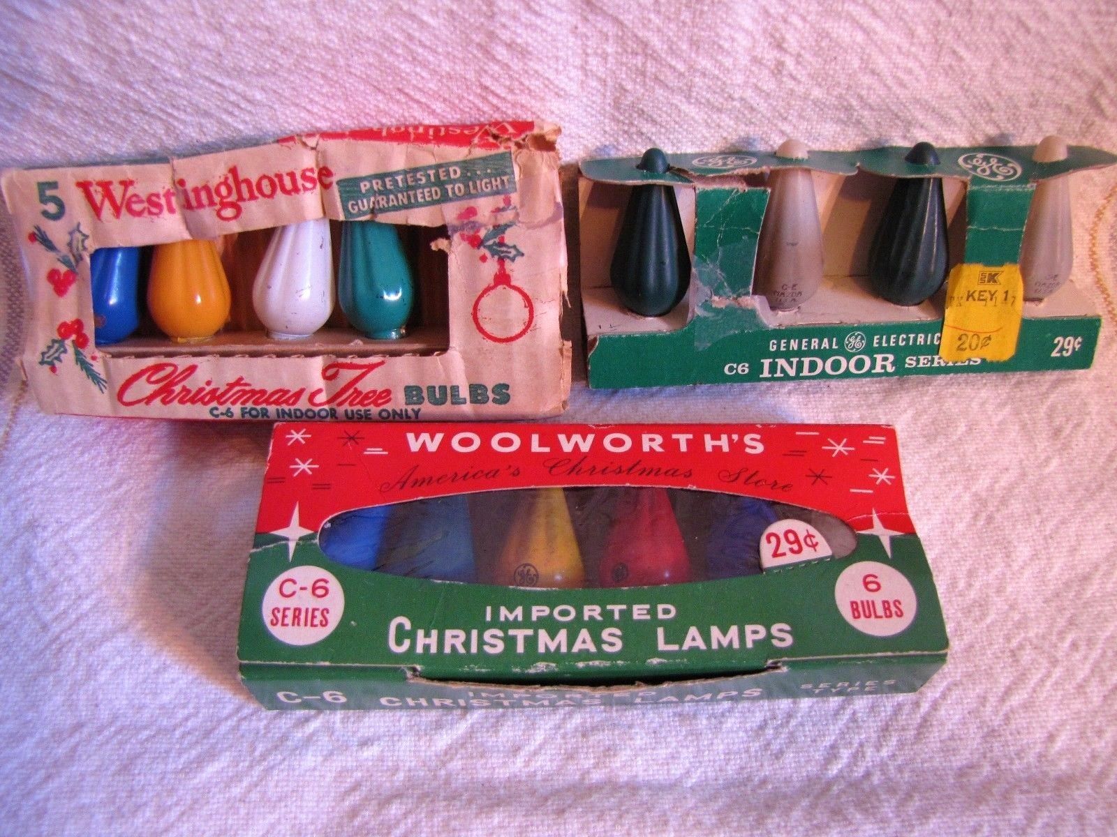 Title (ebay affiliate link): VTG C6 XMAS LIGHT BULB LOT OF 3~WESTINGHOUSE~GE MAZDA~WOOLWORTHS~BOXES~WORKING