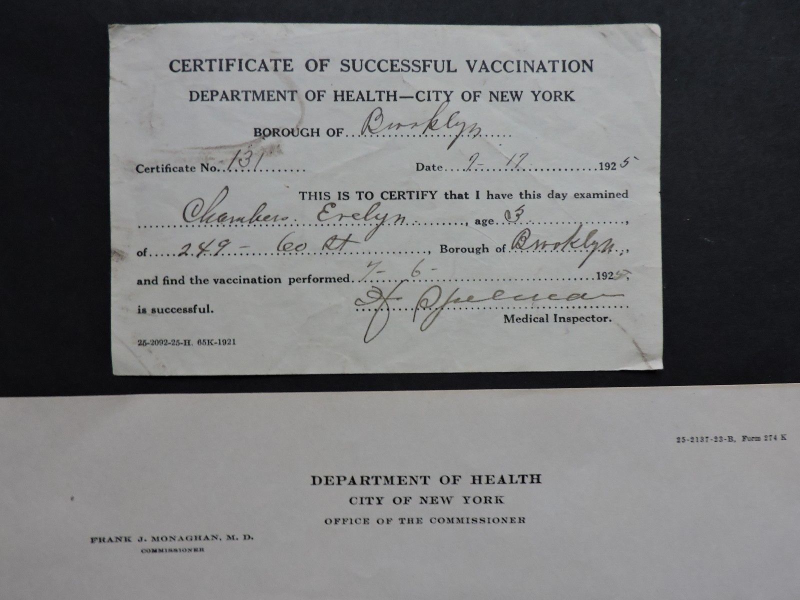 1925 BROOKLYN NY DEPT HEALTH LETTER + VACCINATION CERTIFICATE DOCUMENT ! MEDICAL