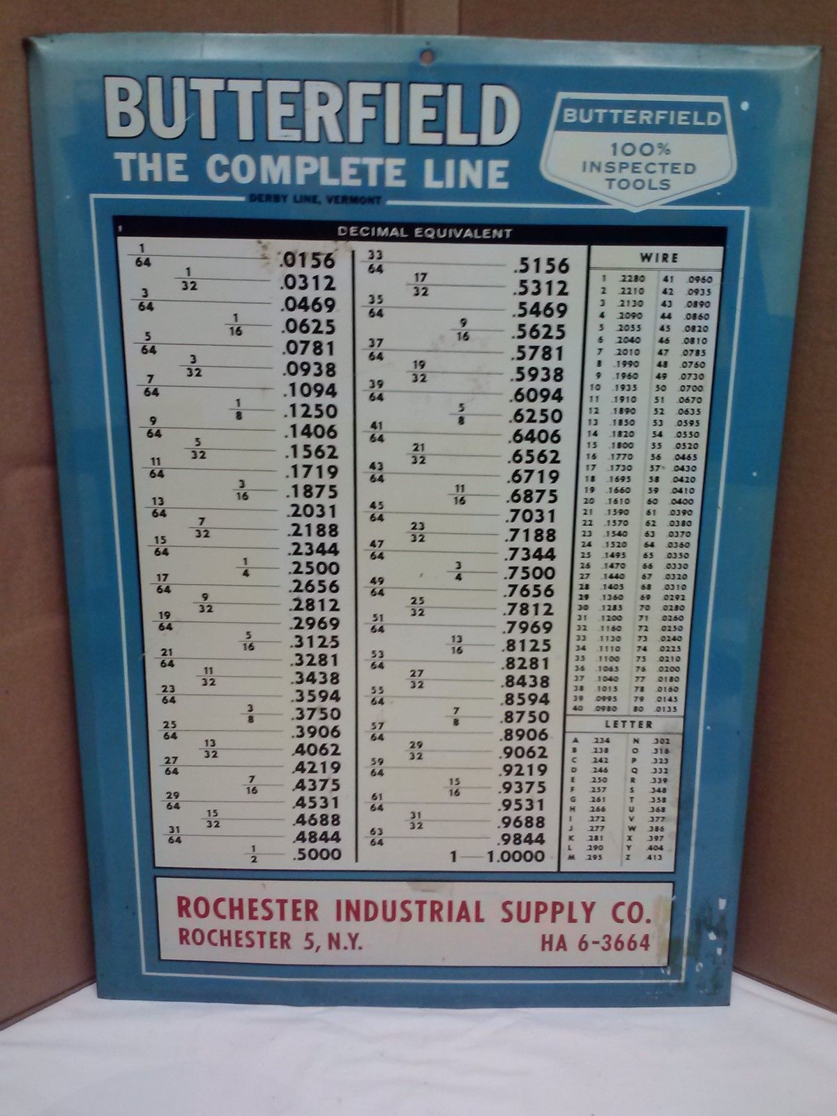 Title (ebay affiliate link): Vintage Butterfield Tools Tin Shop Sign Decimal Equivalent Chart 16"x22"