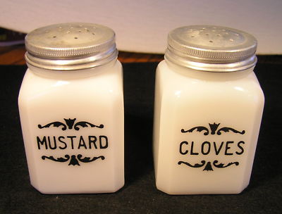 TWO VINTAGE MILKGLASS SPICE JARS WITH LIDS EXC. COND.