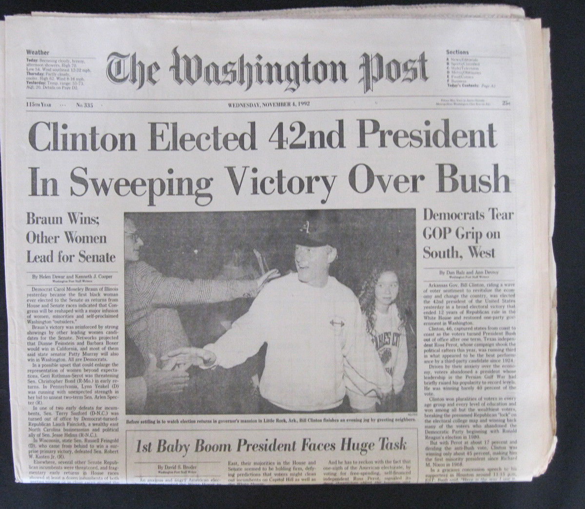 Title (ebay affiliate link): THE WASHINGTON POST NEWSPAPER, NOVEMBER 4, 1992. CLINTON ELECTED 42ND PRESIDENT