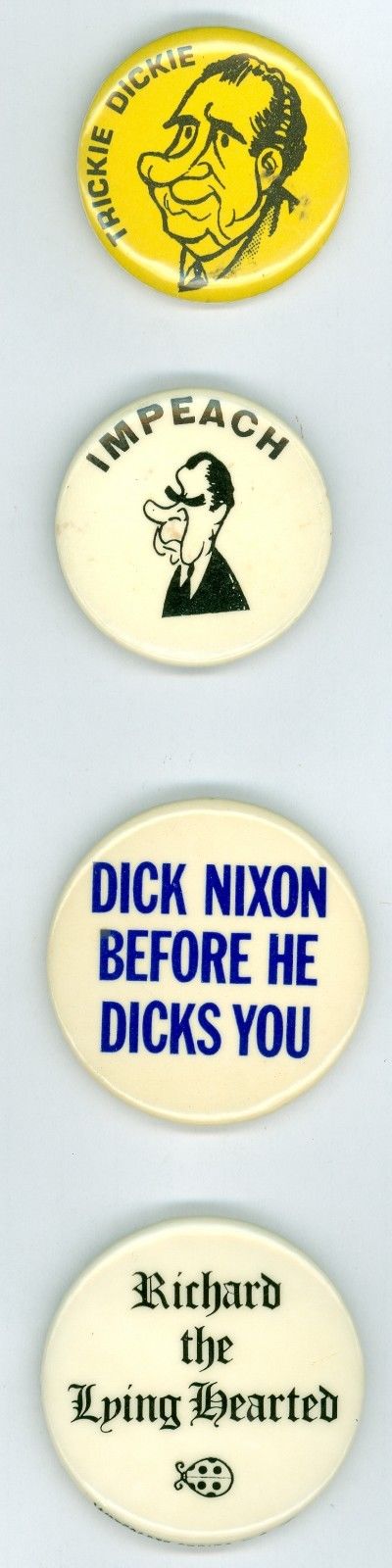 Title (ebay affiliate link): 4 Vintage Anti-President Richard Nixon Political Cause Pinback Buttons Trickie