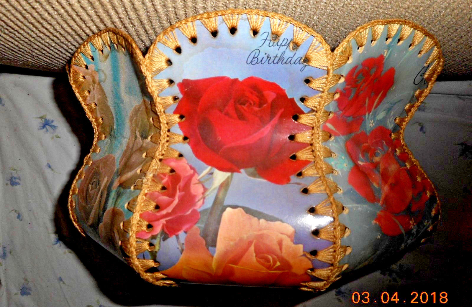 Title (ebay affiliate link): AAFA ANTIQUE EARLY 1900s FOLK ART GREETING CARD ART SEWN BASKET