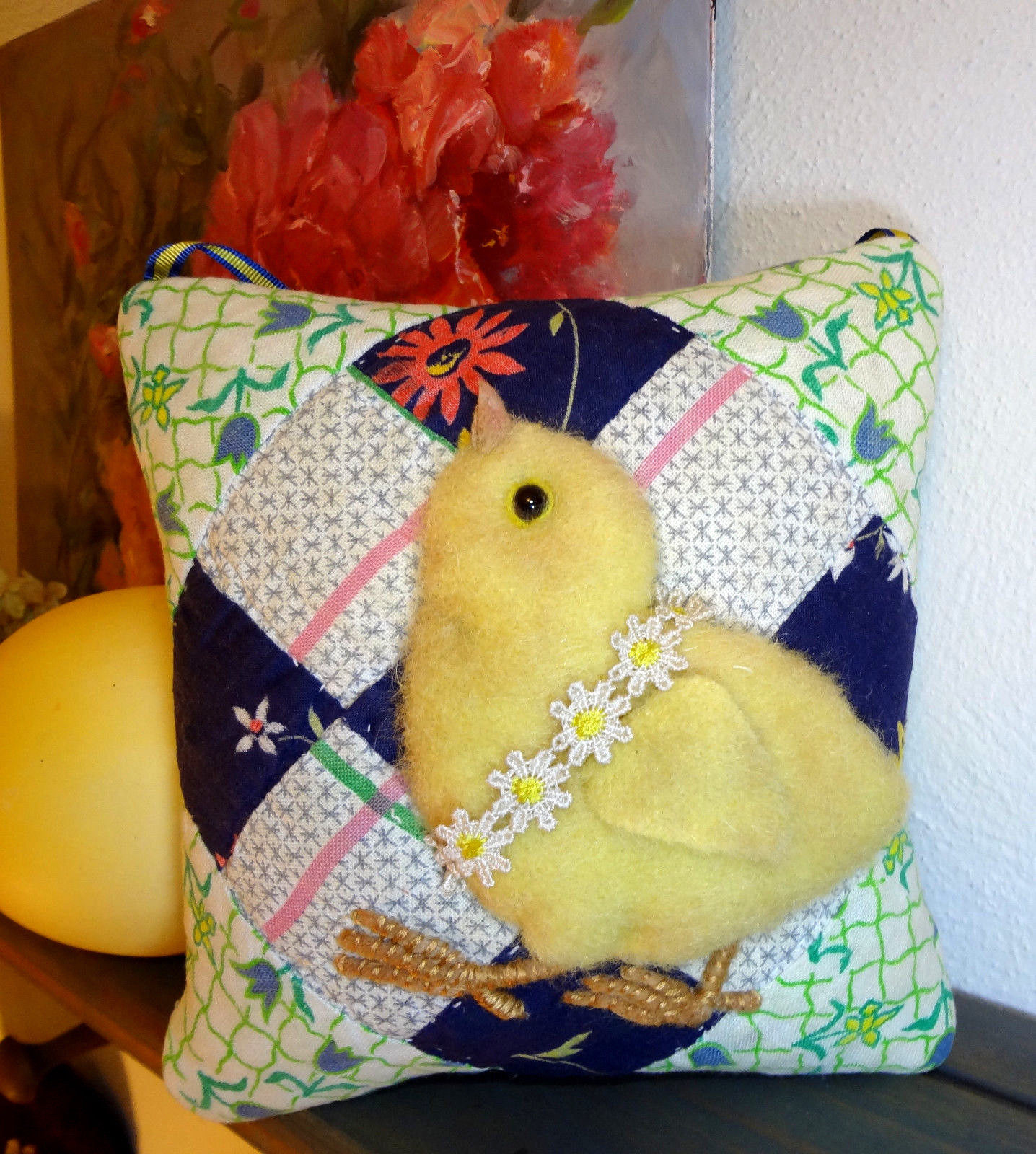 Title (ebay affiliate link): EASTER CHICK ON ANTIQUE QUILT CUPBOARD PILLOW ~ ORIGINAL FABRIC ART By Renate''