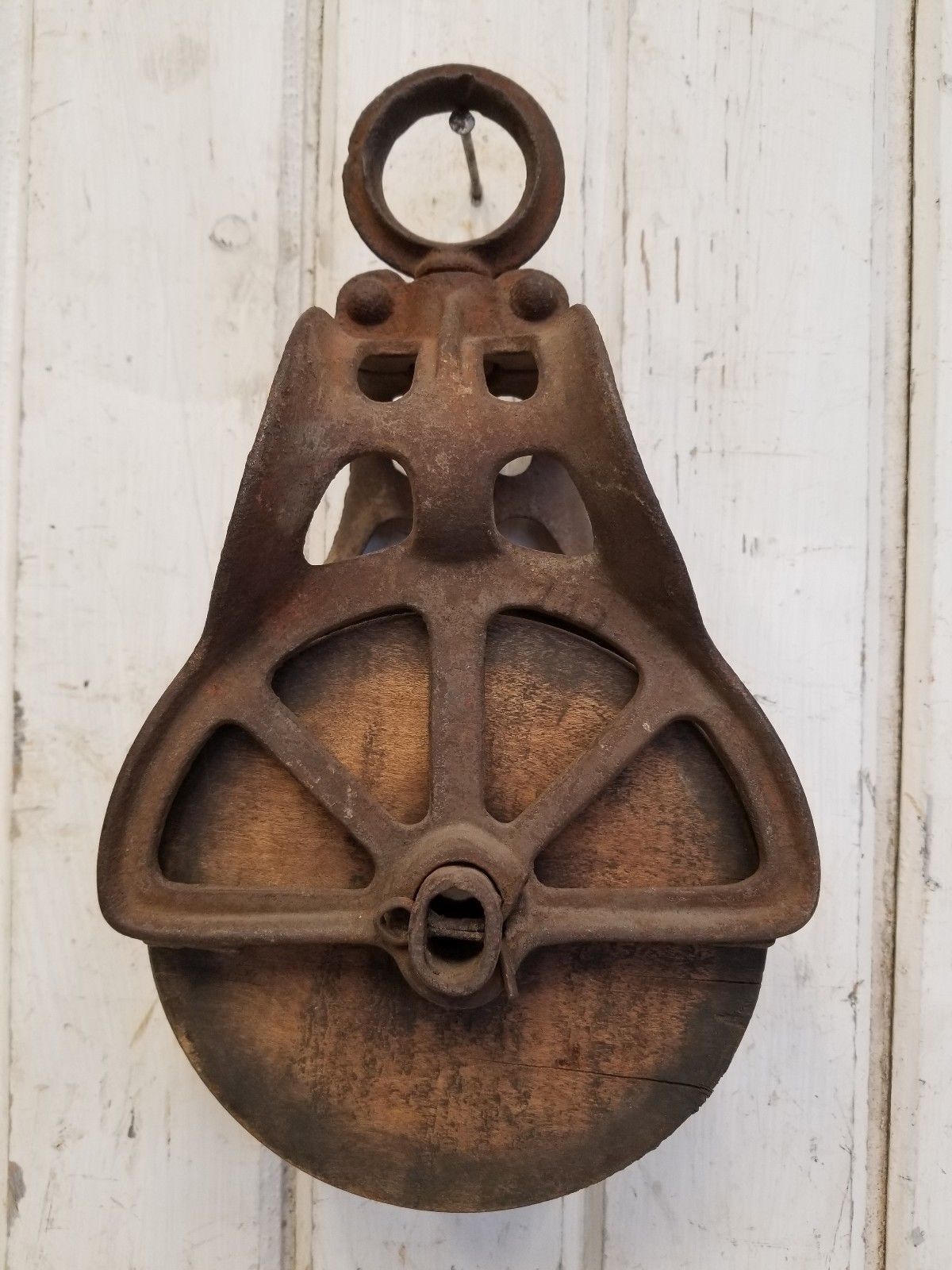 Title (ebay affiliate link): Antique Cast Iron & Wood Barn Pulley ~ Old Vintage Farm Ship Primitive Tool