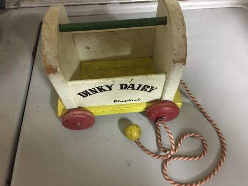 Title (ebay affiliate link): Vintage Playskool Dinky Dairy Wood Toy Wagon Milk Bottle Pull Toy