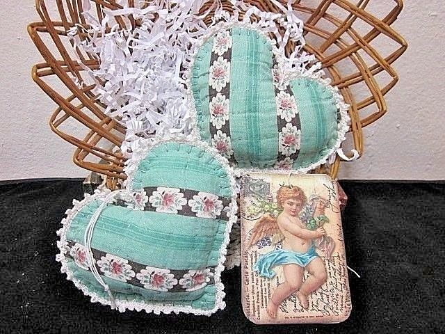 Title (ebay affiliate link): 2 Quilted Hearts teal cotton ecru crochet edge bowl filler shelf tuck collage