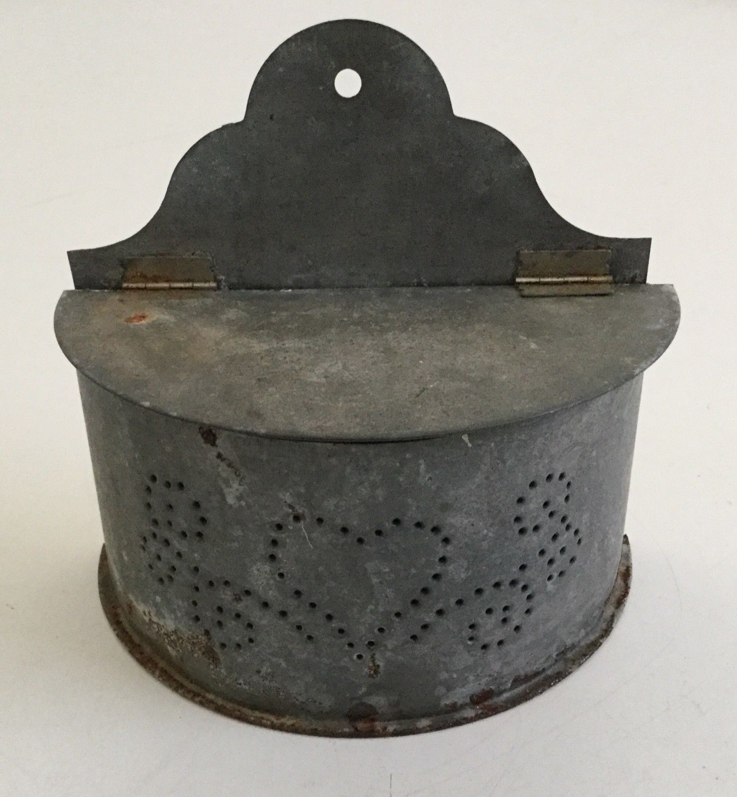 Title (ebay affiliate link): Great Primitive Tin Wall Box Saltbox with Heart Punch Work