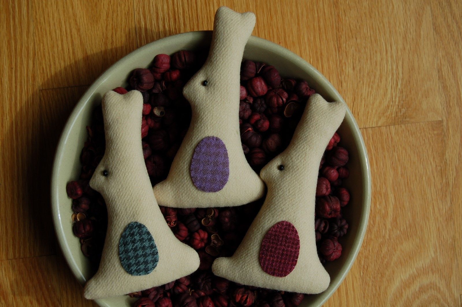 Primitive Easter Off White Wool Bunny Ornies with Egg Applique