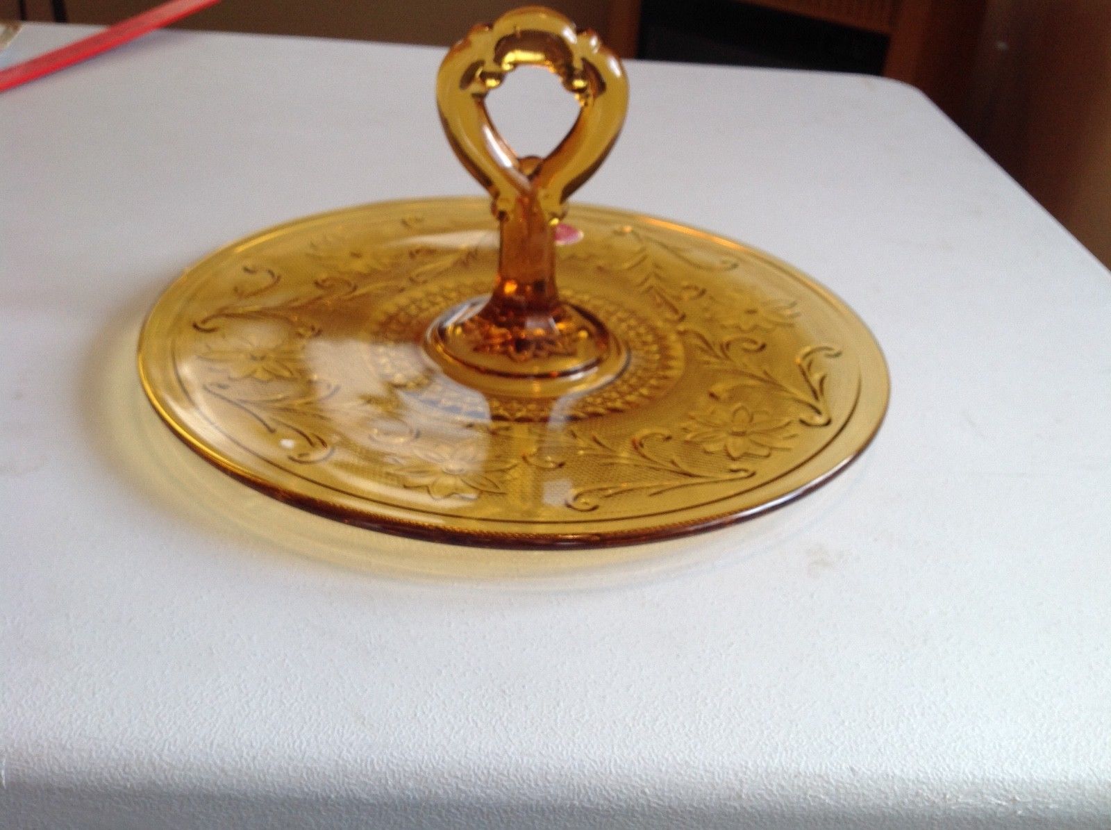 Title (ebay affiliate link): Vintage Tiara Gold/Amber Glass Serving Tray with Center Handle