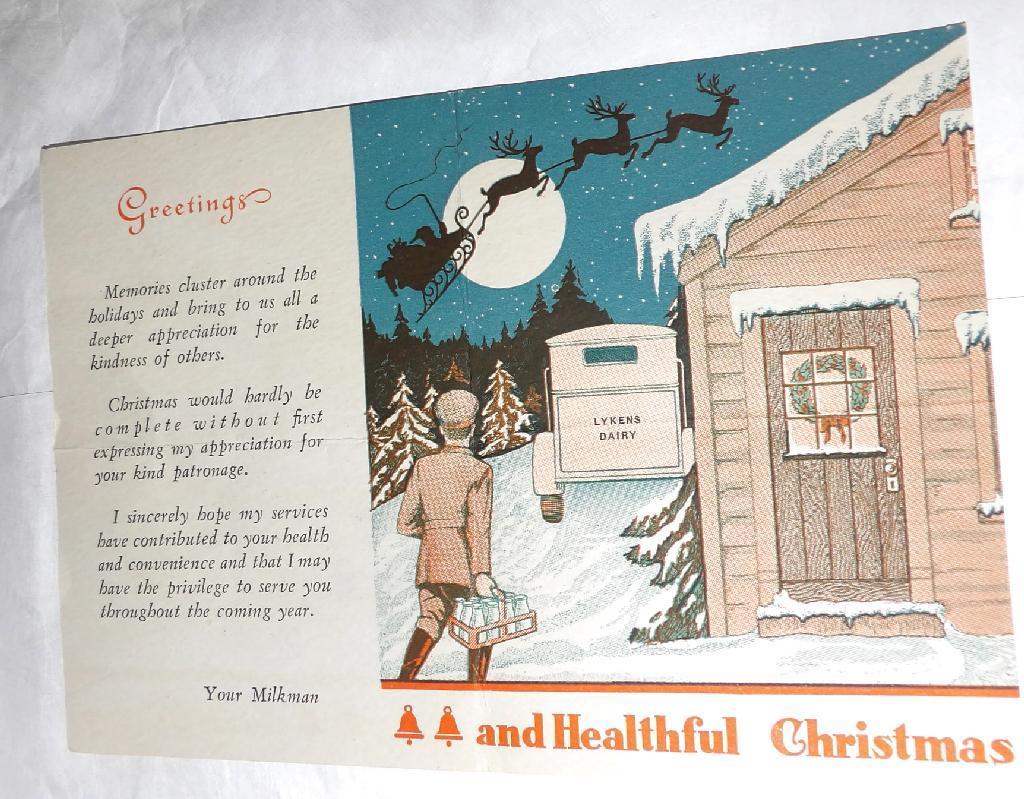 VTG 40s 50s XMAS CARD PAPER LOCAL LYKENS PA MILKMAN DAIRY TRUCK SANTA REINDEER