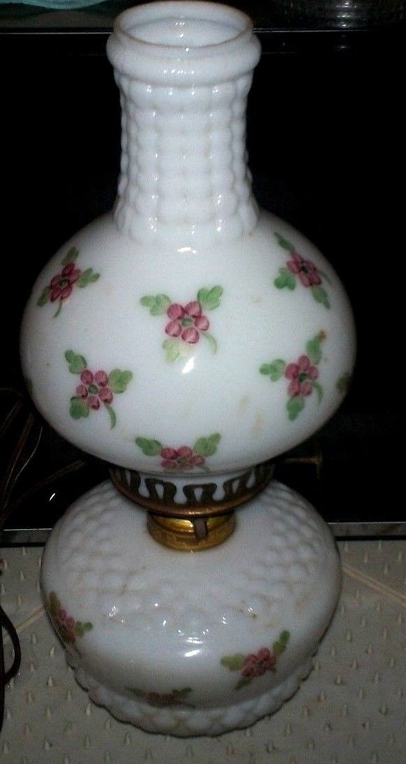 Title (ebay affiliate link): VINTAGE WHITE MILK GLASS ELECTRIFIED CONVERTED KEROSENE OIL LAMP w HP BLOSSOMS