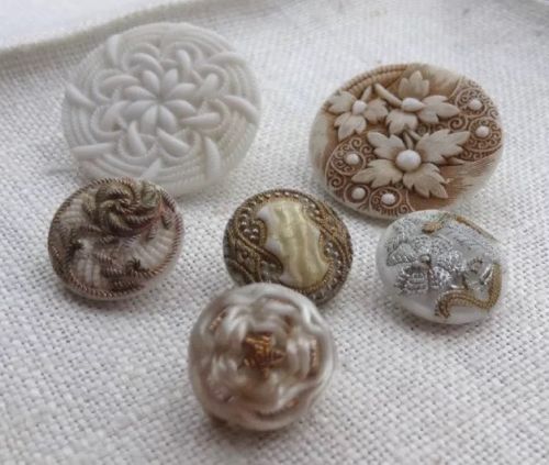 Lot of 6 Antique White Lacy Milk Glass Buttons