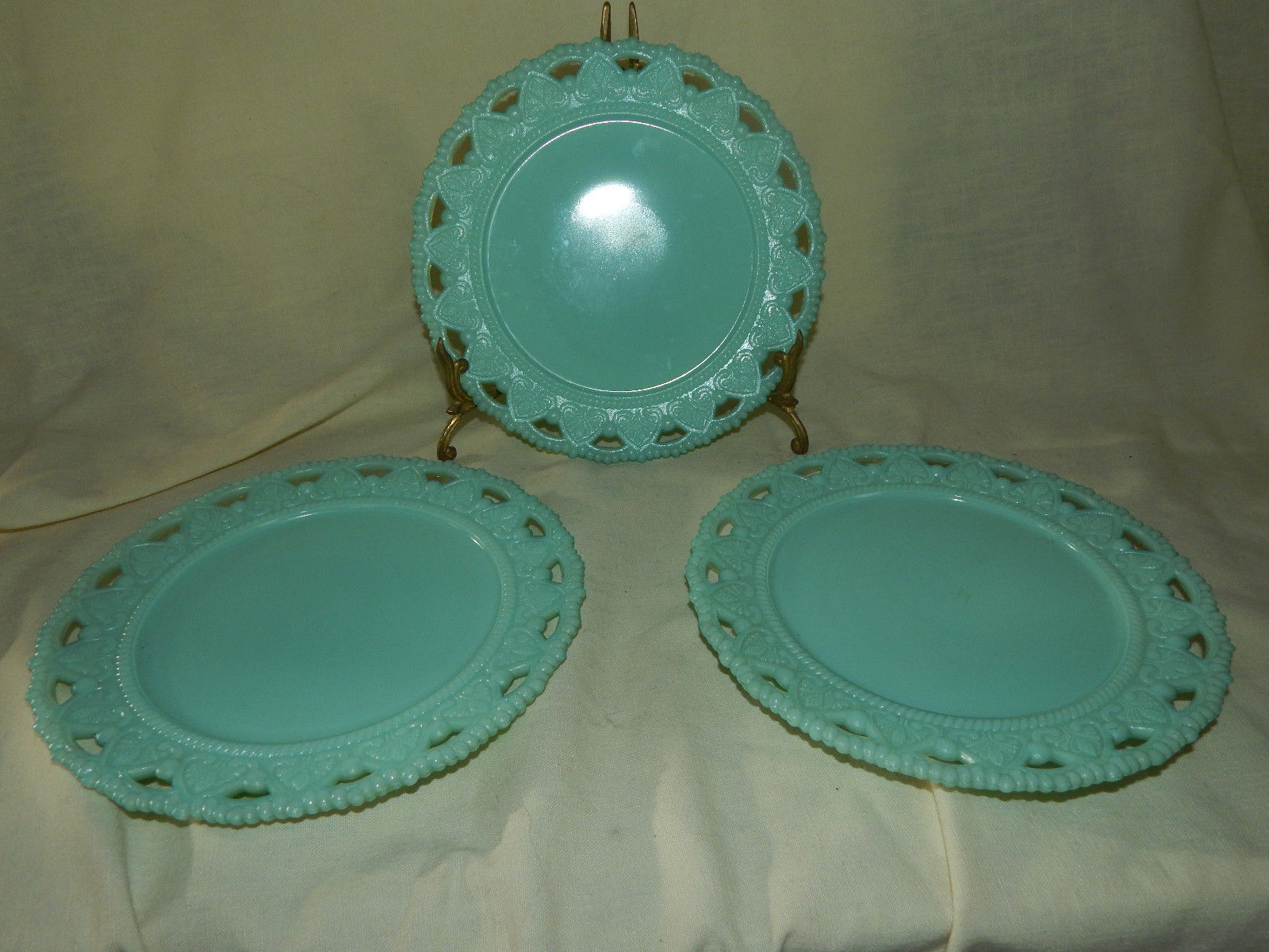 Title (ebay affiliate link): 3 VTG BLUE MILK GLASS Lace Open Edge 8" Salad DESSERT Plates Spades Hearts
