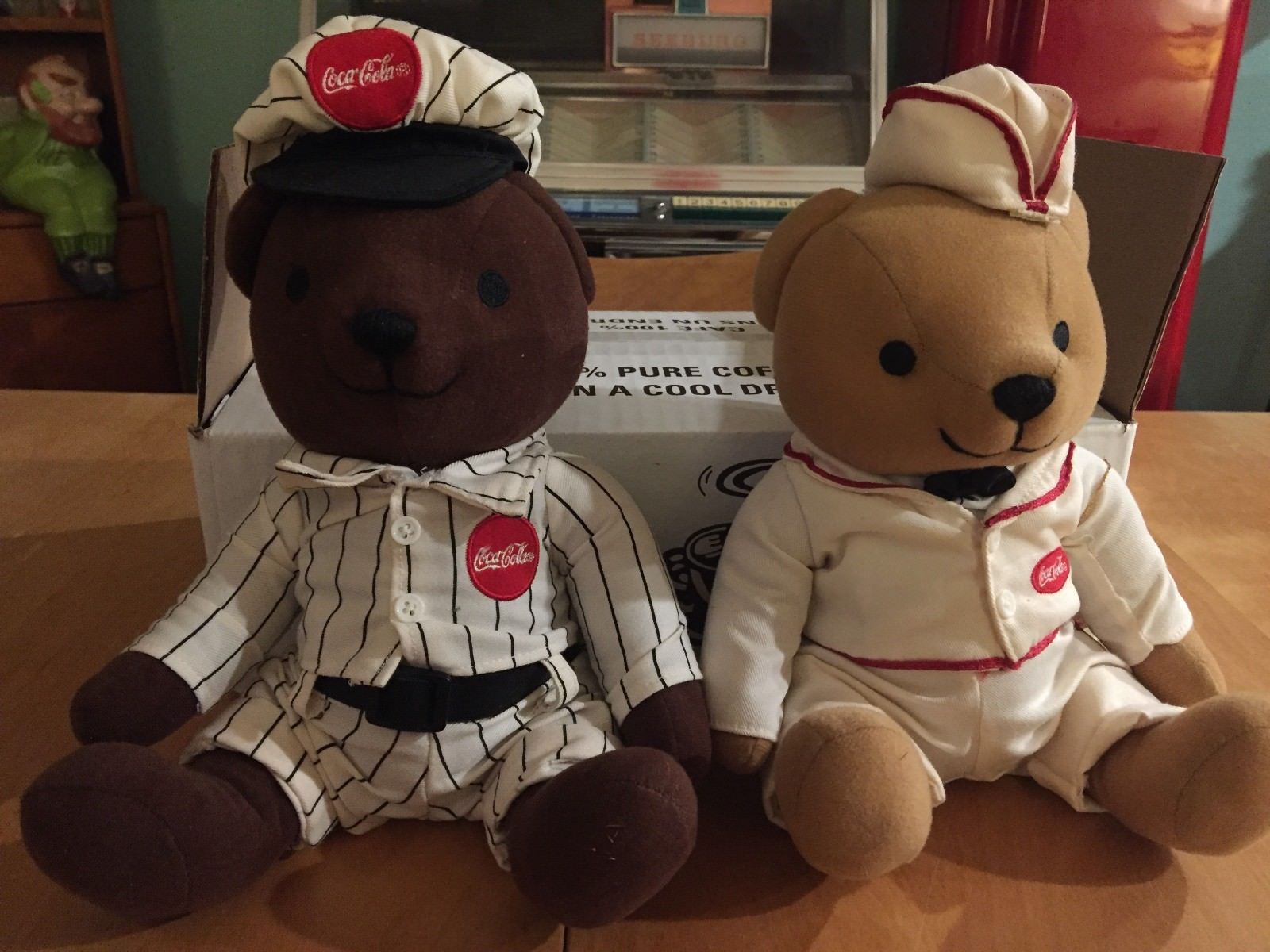 Title (ebay affiliate link): Coca Cola Bear plush set of two- dressed as vintage soda jerk & salesman