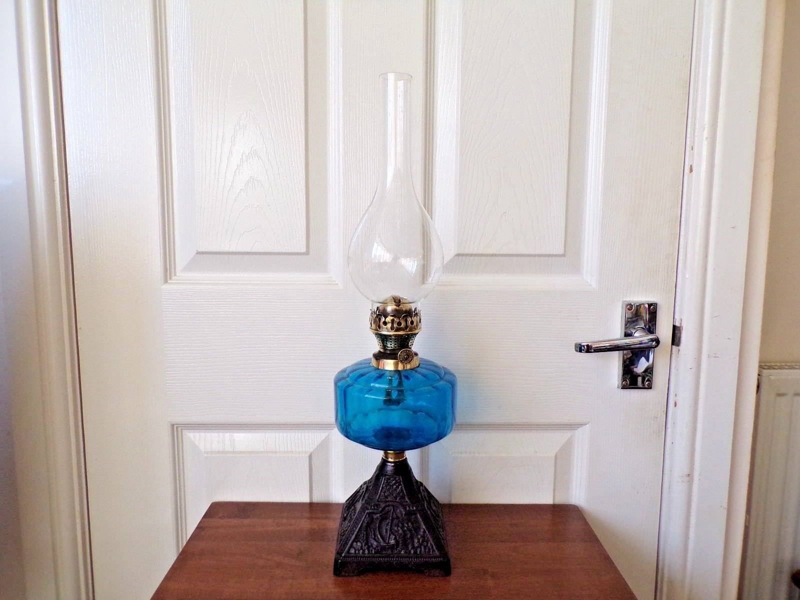 Title (ebay affiliate link): Victorian oil lamp cast iron base with Blue glass font working order